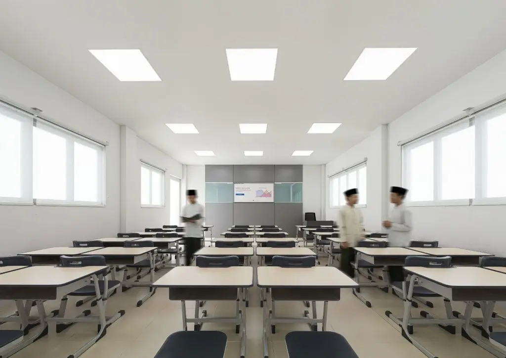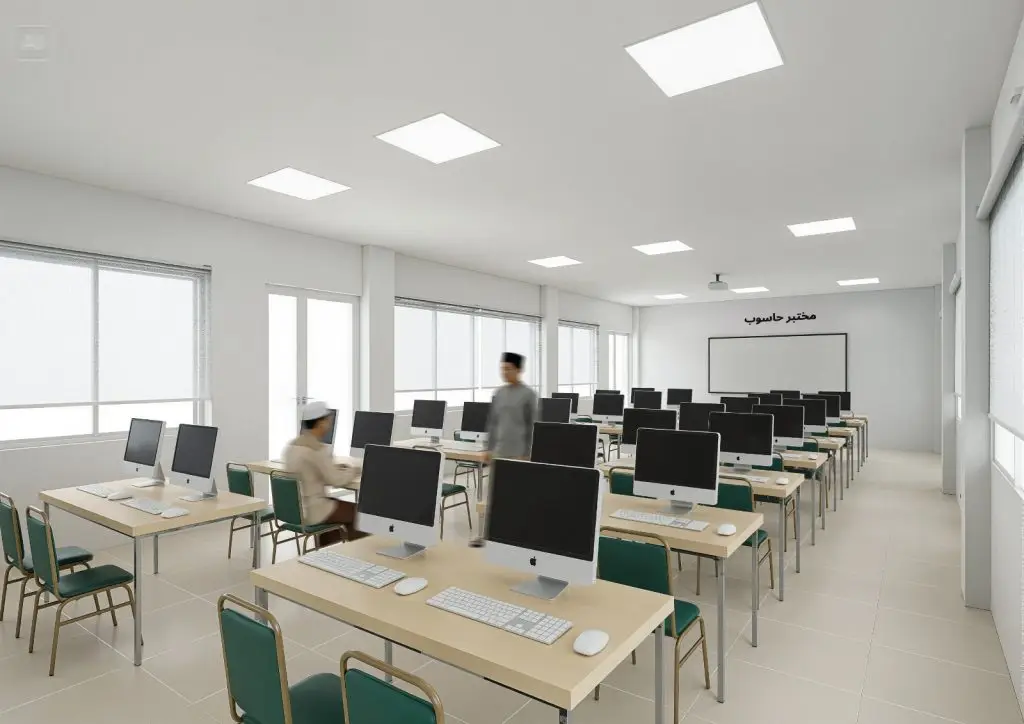 Setiap ruang belajar dilengkapi dengan pendingin udara (AC), meja dan kursi individual untuk setiap santri, loker buku pribadi, serta TV proyektor sebagai sarana pendukung pembelajaran yang interaktif dan nyaman.